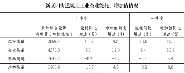 分街道看,上半年新區(qū)四街道規(guī)上工業(yè)企業(yè)綜合能源消費(fèi)量累計達(dá)16891.7噸標(biāo)準(zhǔn)煤,占全區(qū)比重達(dá)96.8%,同比增長1.8%,高于全區(qū)平均水平0.4個百分點。受不同產(chǎn)業(yè)結(jié)構(gòu)影響,四街道用能效率分化明顯,同一季度相比,除浮橋街道外其余三街道節(jié)能降耗工作均趨于弱化。其中,常泰街道綜合能耗同比下降0.3%,高于增加值增速4.4個百分點;江南街道綜合能耗同比增長11.5%,高于增加值增速2.3個百分點;金龍街道綜合能耗同比增長11.5%,低于增加值增速2.9個百分點,增加值與能耗增速差值較一季度下滑1.4個百分點。