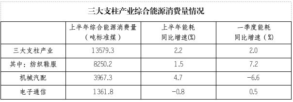 分行業(yè)看,上半年全區(qū)規(guī)模以上工業(yè)三大支柱產(chǎn)業(yè)合計綜合能源消費(fèi)量達(dá)13579.3噸標(biāo)準(zhǔn)煤,能源消費(fèi)量同比增長2.2%。其中,紡織鞋服能耗占全區(qū)比重達(dá)47.3%,能源消費(fèi)量同比增長1.5%,增速較一季度放緩5.7個百分點;機(jī)械汽配能源消費(fèi)量同比增長4.7%,增速較一季度擴(kuò)大11.3個百分點;電子通信能源消費(fèi)量同比降低0.8%。六大重點耗能行業(yè)合計能耗同比增長0.3%,增幅較一季度下滑0.8個百分點。